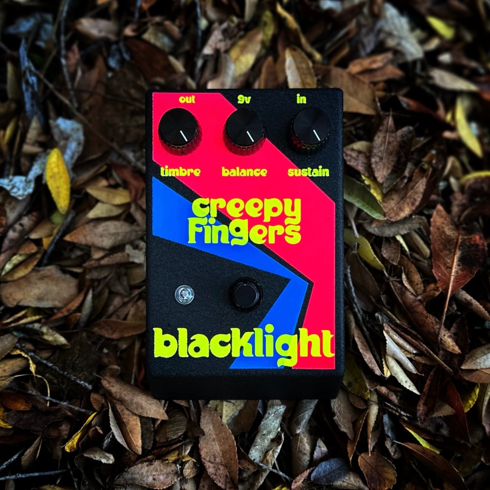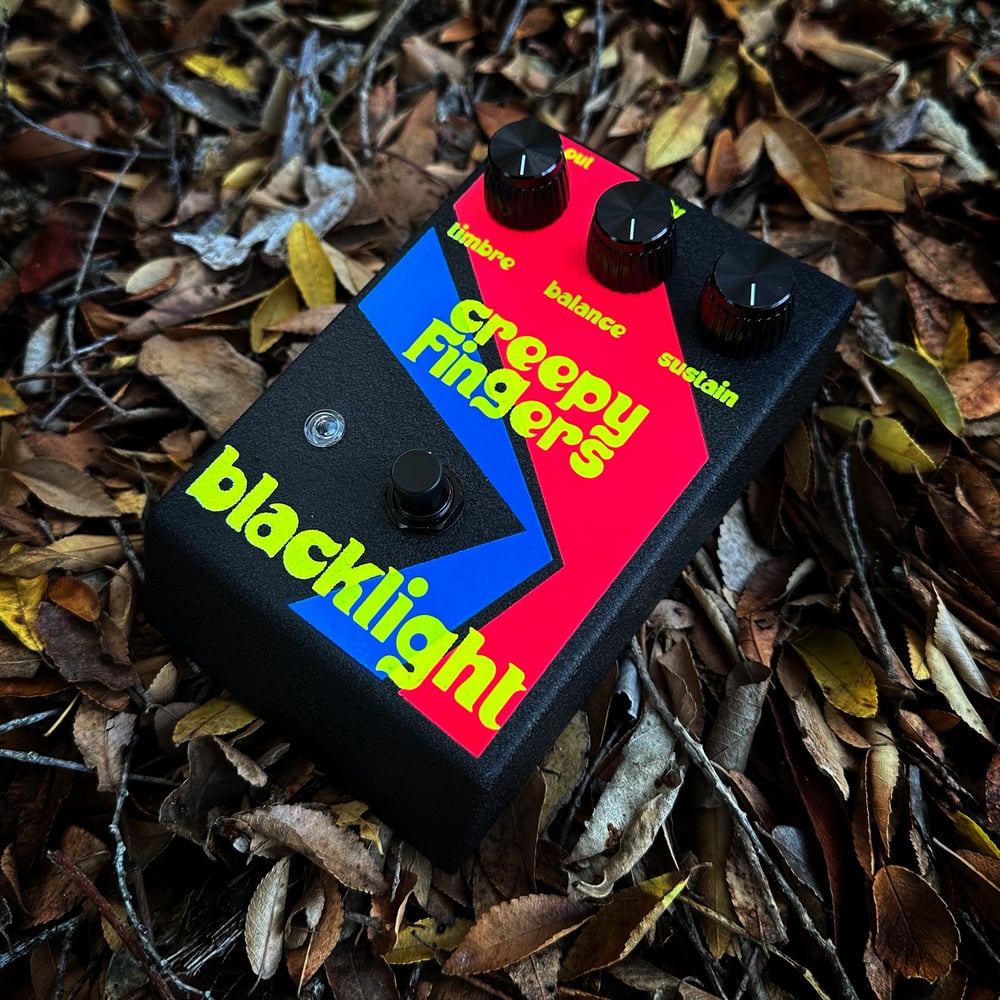 While based on classics the Blacklight has all the modern updates. True bypass switching, LED indication (UV colored of course), and can be powered by common negative tip polarity 9v power supplies. Silicon transistors have been adapted for use in the first two positions. This ensures lower noise and a more predictable response in different temperatures. An NOS SFT type germanium is used in the third position. They are hand selected along with the germanium diode to provide rich sustain and low noise while giving good clean up with the guitar volume depending on the sustain knob position. Wima film capacitors, styroflex, and Nichicon audio grade electros are featured in the signal path.